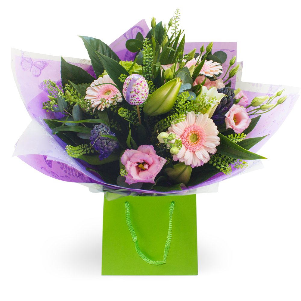 Have a fun filled Easter with lots of yummy chocolate and gorgeous flowers. The Yummy Easter bouquet is made with lilacs, pinks, blues. Enjoy!